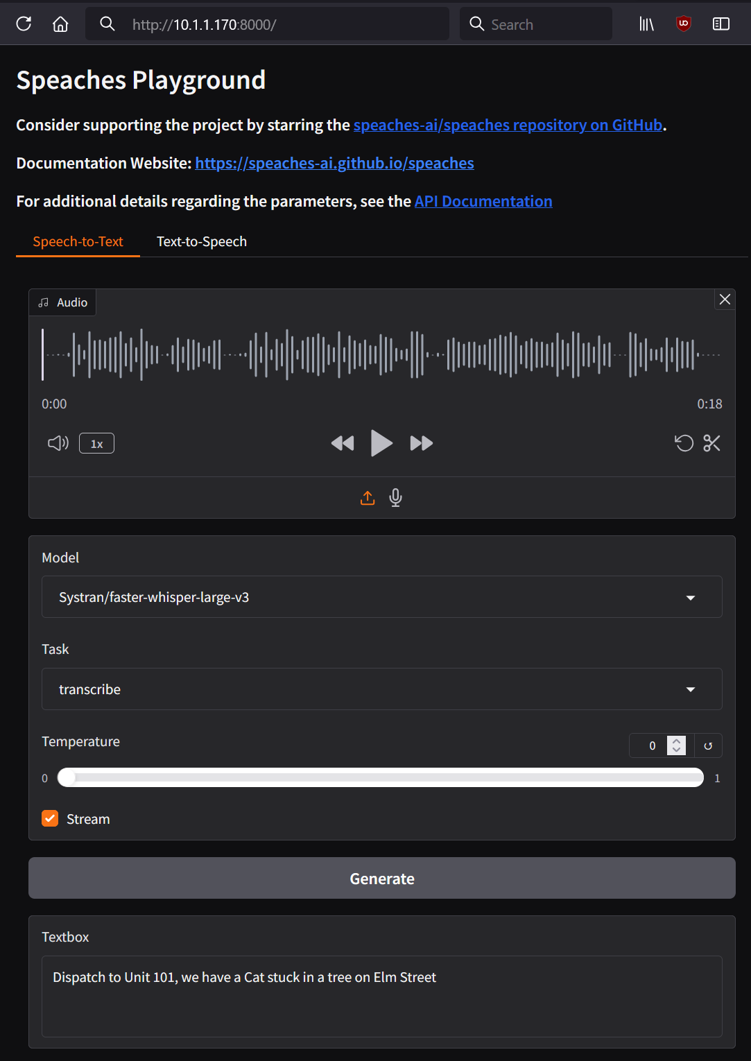 Note: For more information on the various Whisper options see the OpenAI Whisper API documentation. You can also use the Speaches Playground to Upload a call MP3 or WAV file from Trunking Recorder and generate a transcription of the audio. You can test various models to see which one works the best for your setup (accuracy, performance, hardware resources, storage, audio environment). If you want to test a new model you will have to download it first. See Model Discovery for more information.