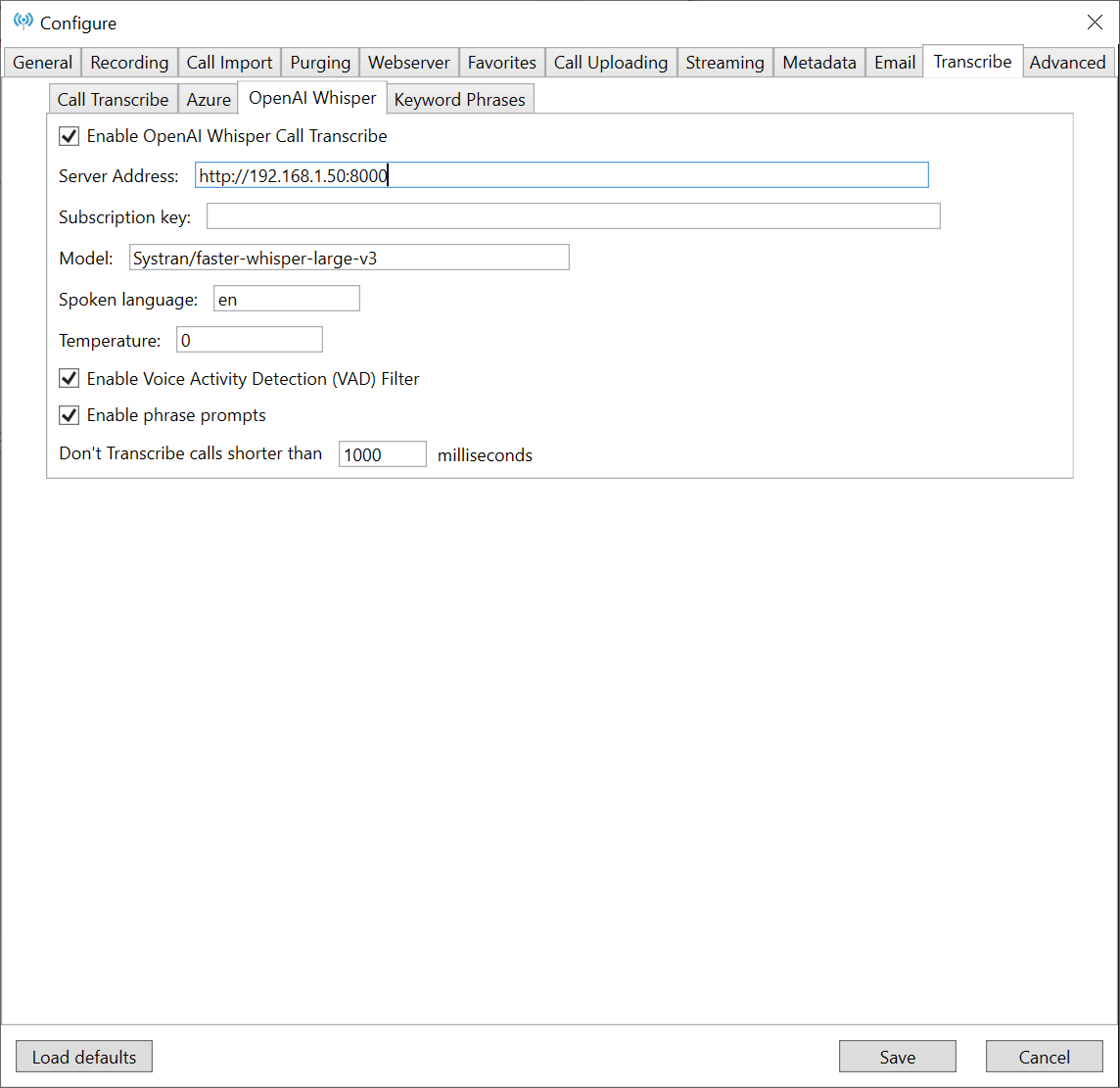 - Check the "Enable OpenAI Whisper Call Transcribe" checkbox.